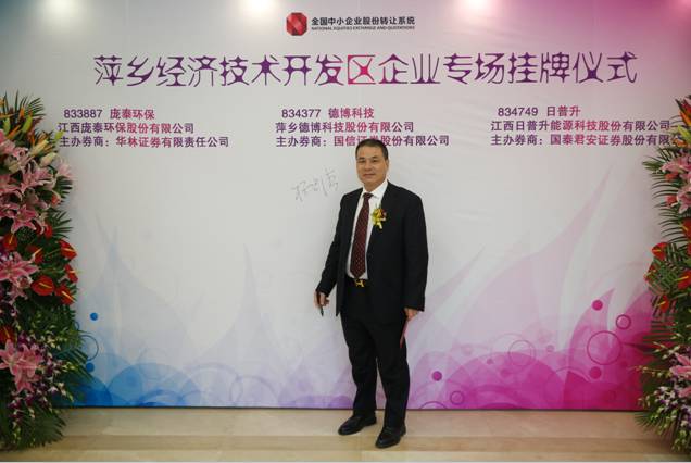 2016年1月5日,萍乡德博科技股份有限公司“新三板”挂牌仪式在北京全国中小企业股份转让系统公司举行,萍乡市委书记刘卫平、市委副书记李江河、副市长亓丕华等市、区两级领导出席了公司的挂牌仪式,公司董事长杨启清陪同,大家一起敲响了开市宝钟。