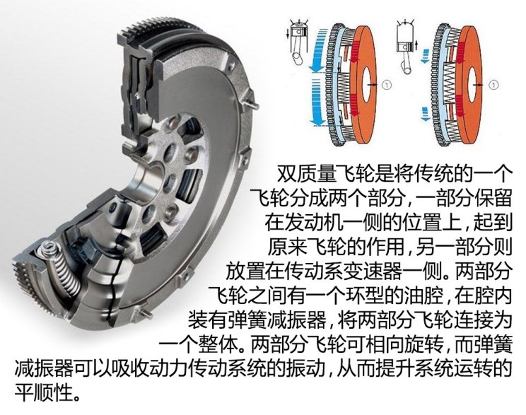 其次还有双质量飞轮。双质量飞轮可以有效抑制发动机运转时的共振现象,同时降低发动机扭矩波动的传递,从而提升驾驶舒适性。