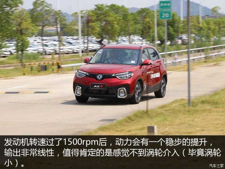 我把这次简单的体验分为两部分,一是动力、底盘部分,第二个是车内噪音部分。我们先说说实际动力体验。小排量发动机有很强推背感是不现实的(此结论仅限于量产车),哪怕是涡轮加持也不会很明显,这台1.0T的东风风神AX4同样如此。因为在1500rpm涡轮开始介入,所以从静止到节气门全开,前20%的行程不会带来很强的动力输出,基本跟普通的1.5L自吸发动机感觉类似。